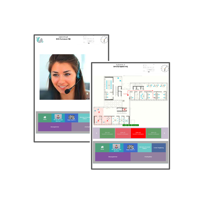 Unternehmensinformationen können auf handelsüblichen Bildschirmen angezeigt werden, um die Gäste auf dem Laufenden zu halten.